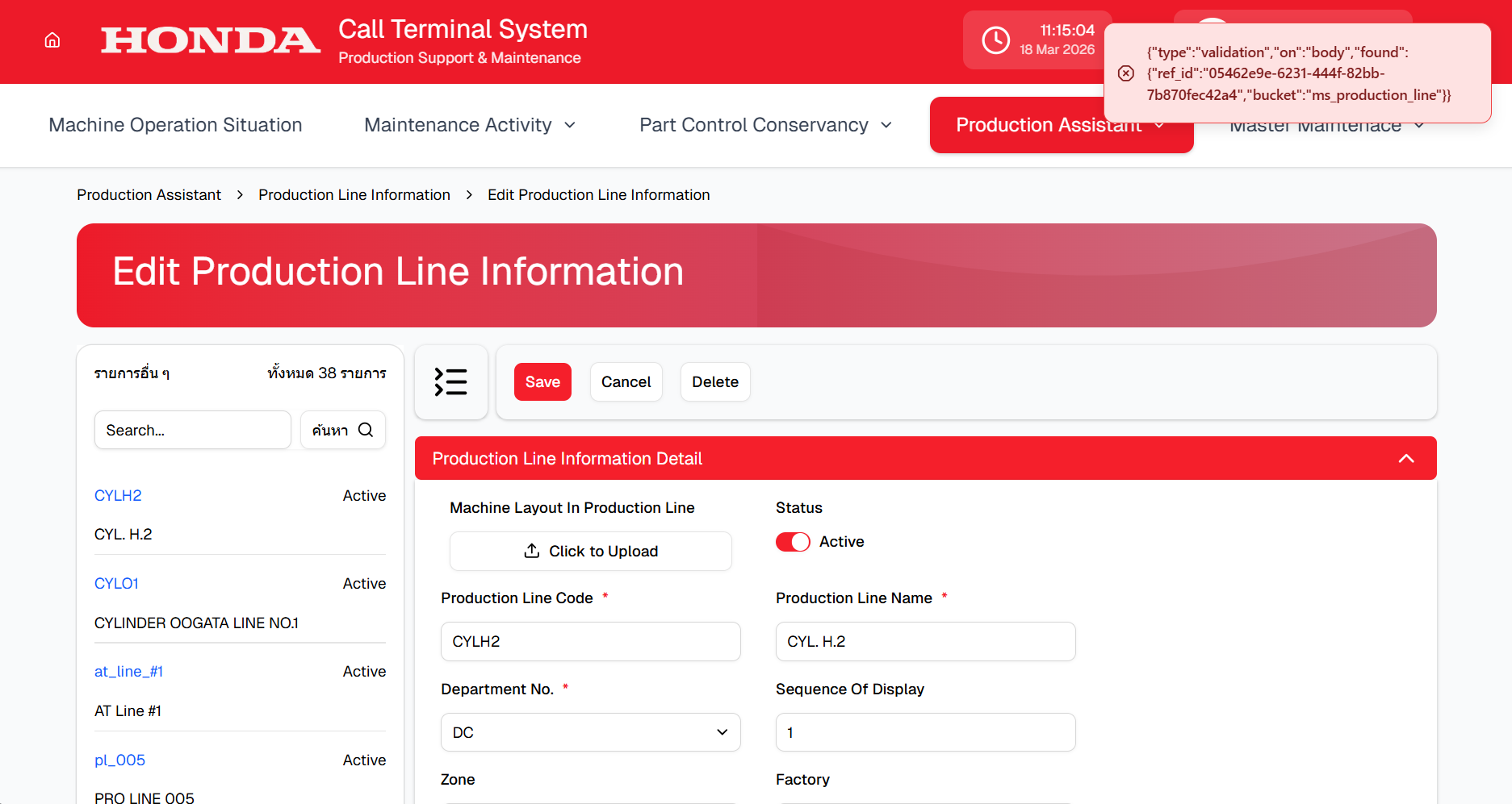 - หน้า List > field Department No, Sequence Of Display, Zone, Location in Factory Layout, Location of Production Line in Zone Layout เมื่อกรอกข้อมูลแล้วข้อมูลไม่มาแสดงหน้า List