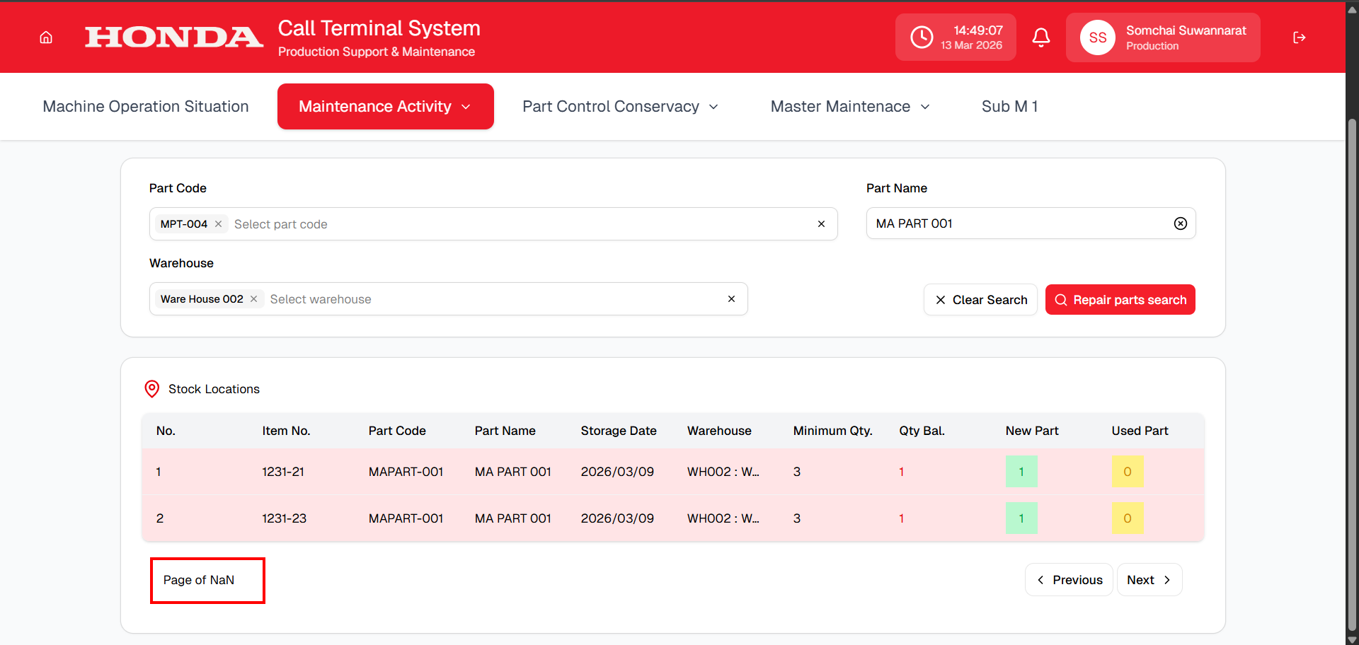 [Call monitor] Issue Maintenance Activity > Stock Retrieval : Stock Locations เช็คการ Sum ข้อมูลใหม่ ปัจจุบัน แสดงเป็น Page of NaN