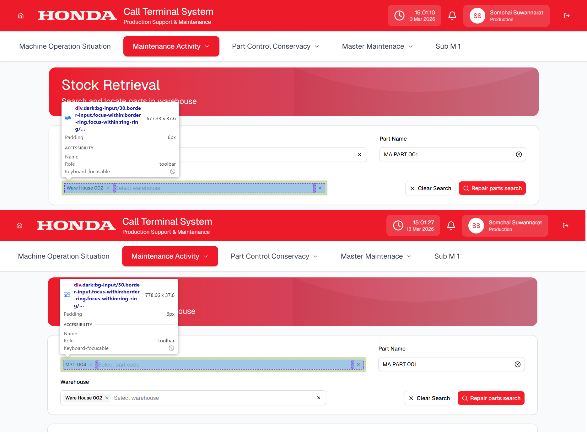 [Call monitor] Issue Maintenance Activity > Stock Retrieval : filter field warehouse เพิ่มความกว้างของกล่องให้เท่ากับ filter field Part code