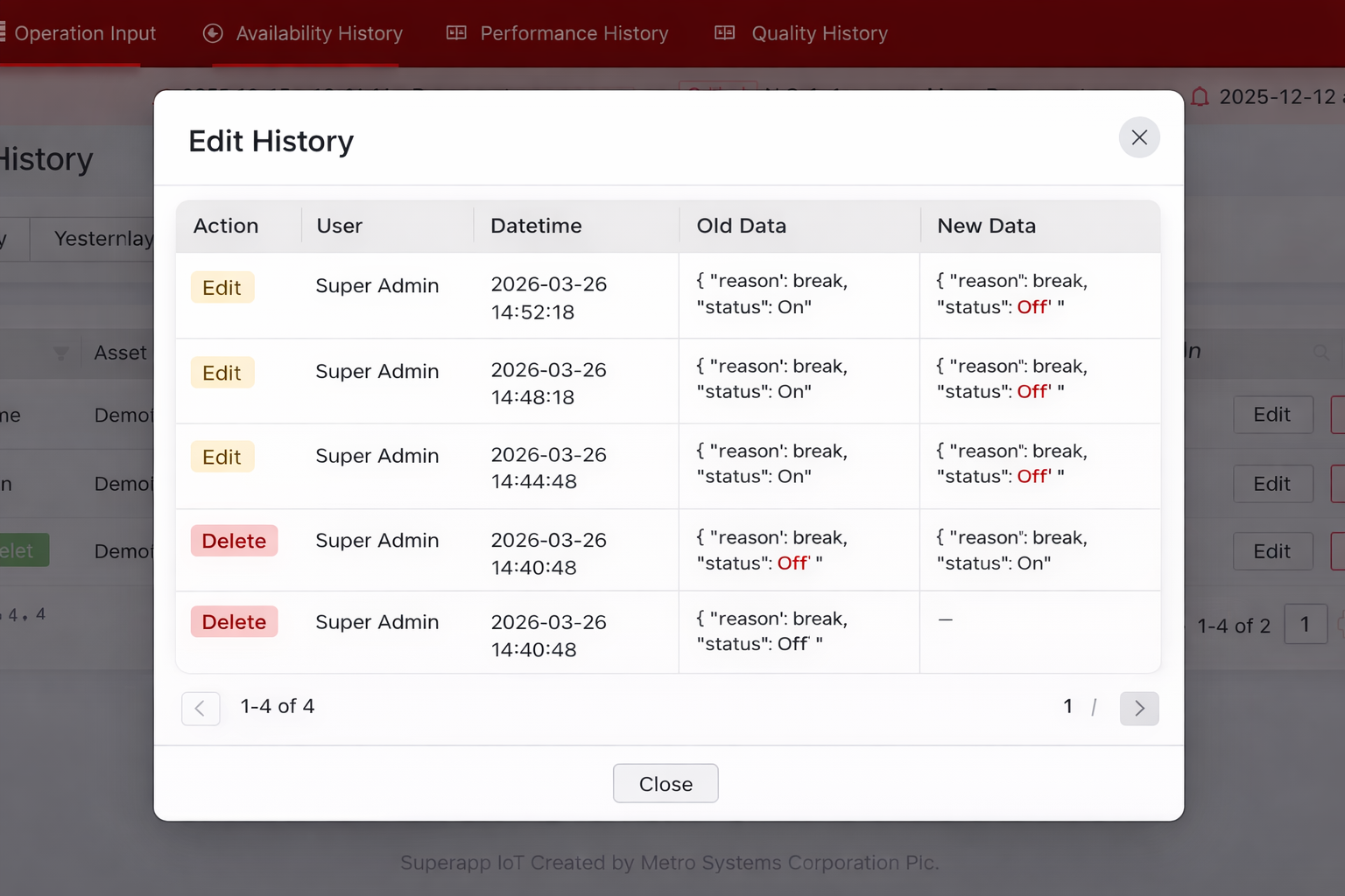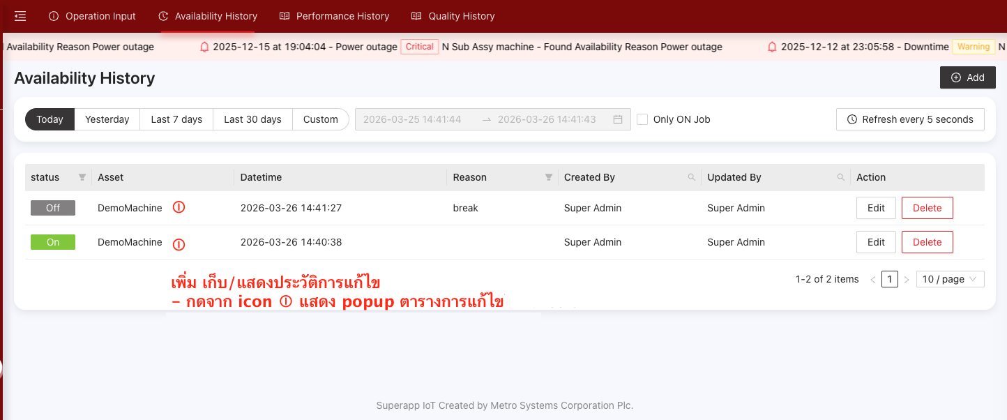 เพิ่มแสดงประวัติการแก้ไข (Edit History) Operation Mode ในหน้า Availability History / Performance History / Quality History เพื่อให้ตรวจสอบการแก้ไขข้อมูลย้อนหลังได้