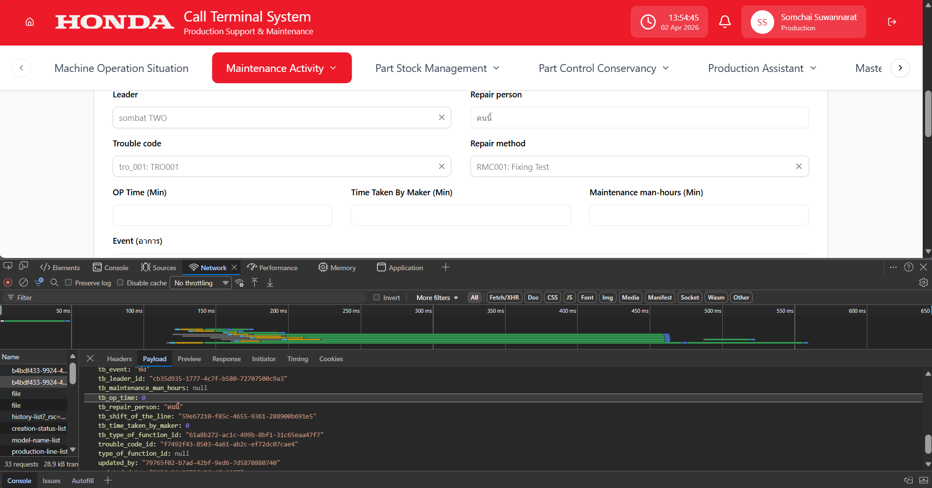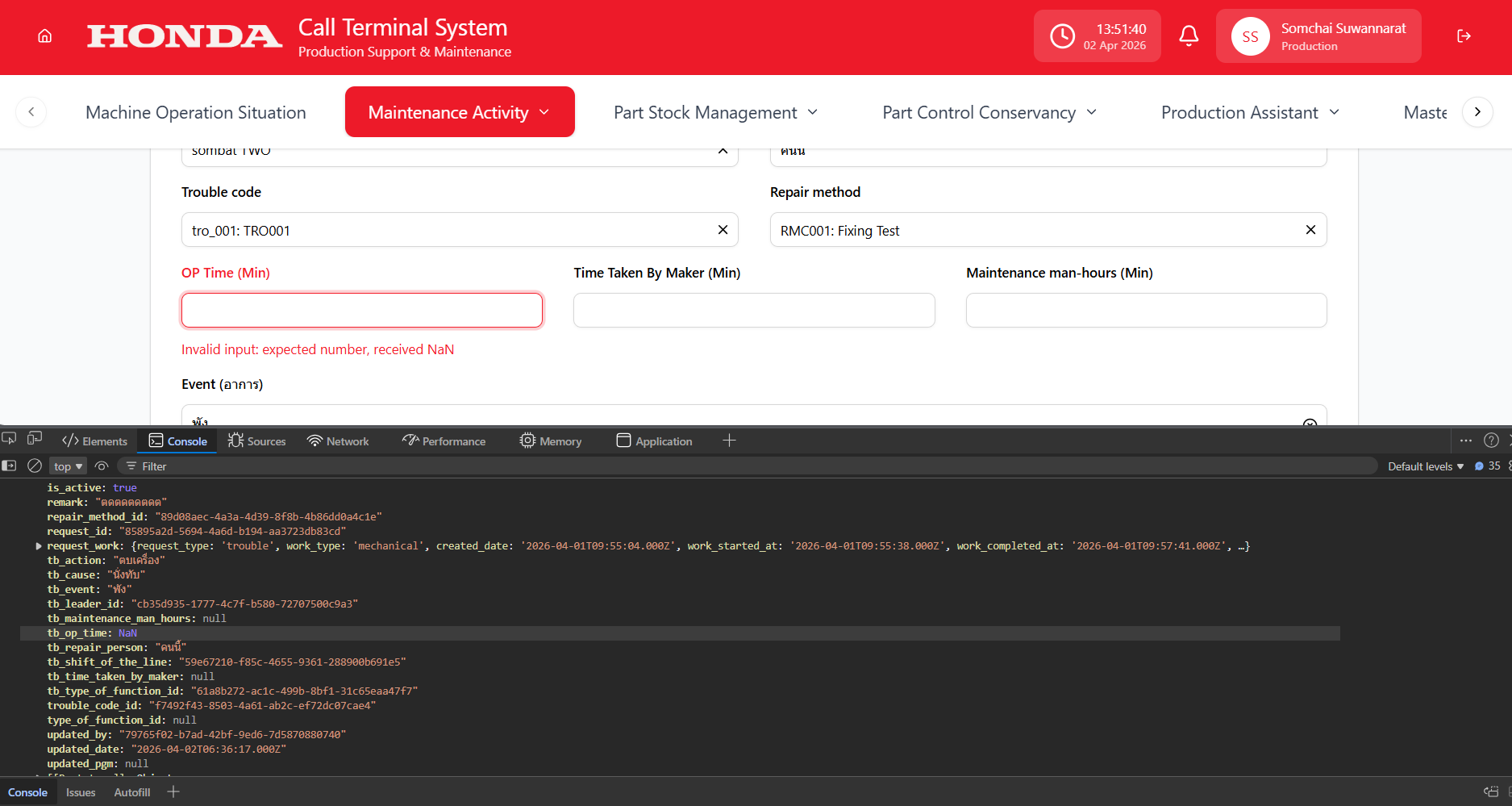 - สามารถ Save ได้โดยที่ยังไม่ได้กรอกข้อมูลเลย แต่พอกรอกข้อมูล(แต่ไม่ครบ) ดันมี field ที่มัน req คือ OP Time โดยเมื่อกด Save แล้วมันขึ้นว่าใส่ข้อมูลใน Field OP Time เป็น NaN
