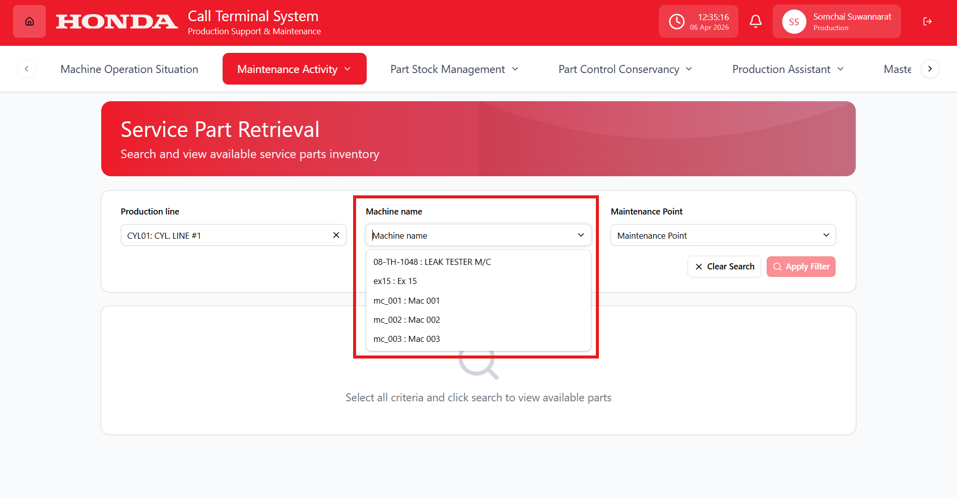 [Call System][Call monitor] Issue Service Part Retrieval : เมื่อจะเลือก machine ต้อง where machine ที่มาจาก Production line ที่เราเลือกเอาไว้ด้วย