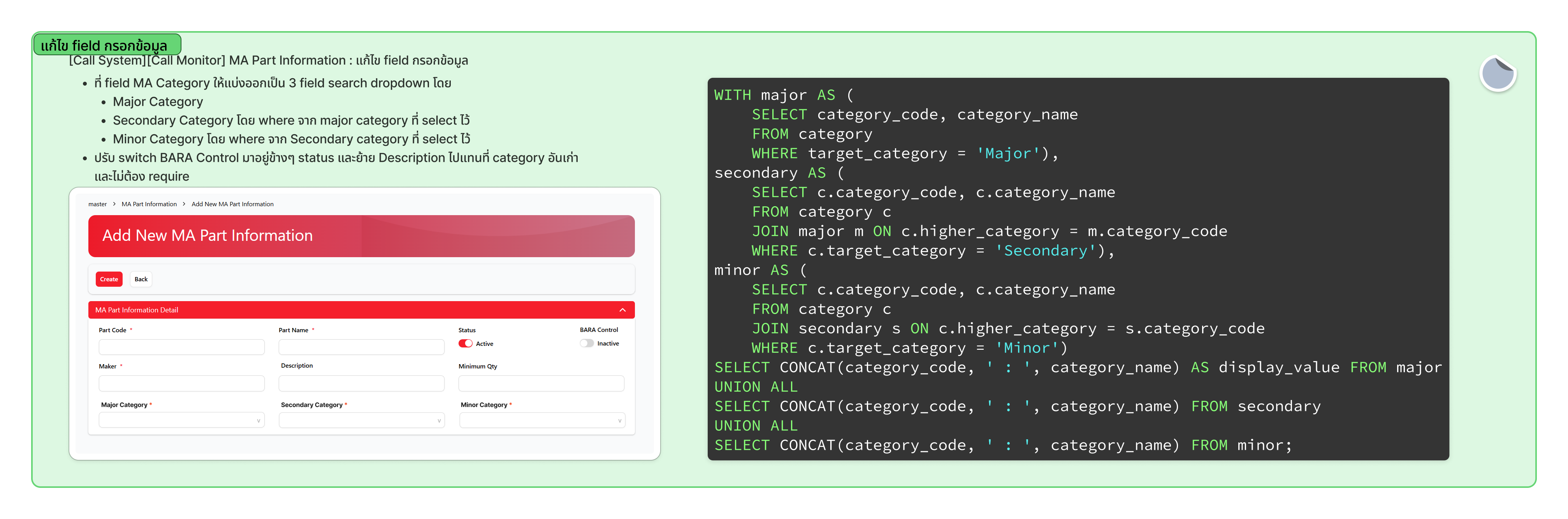 - ที่ field MA Category ให้แบ่งออกเป็น 3 field search dropdown โดย