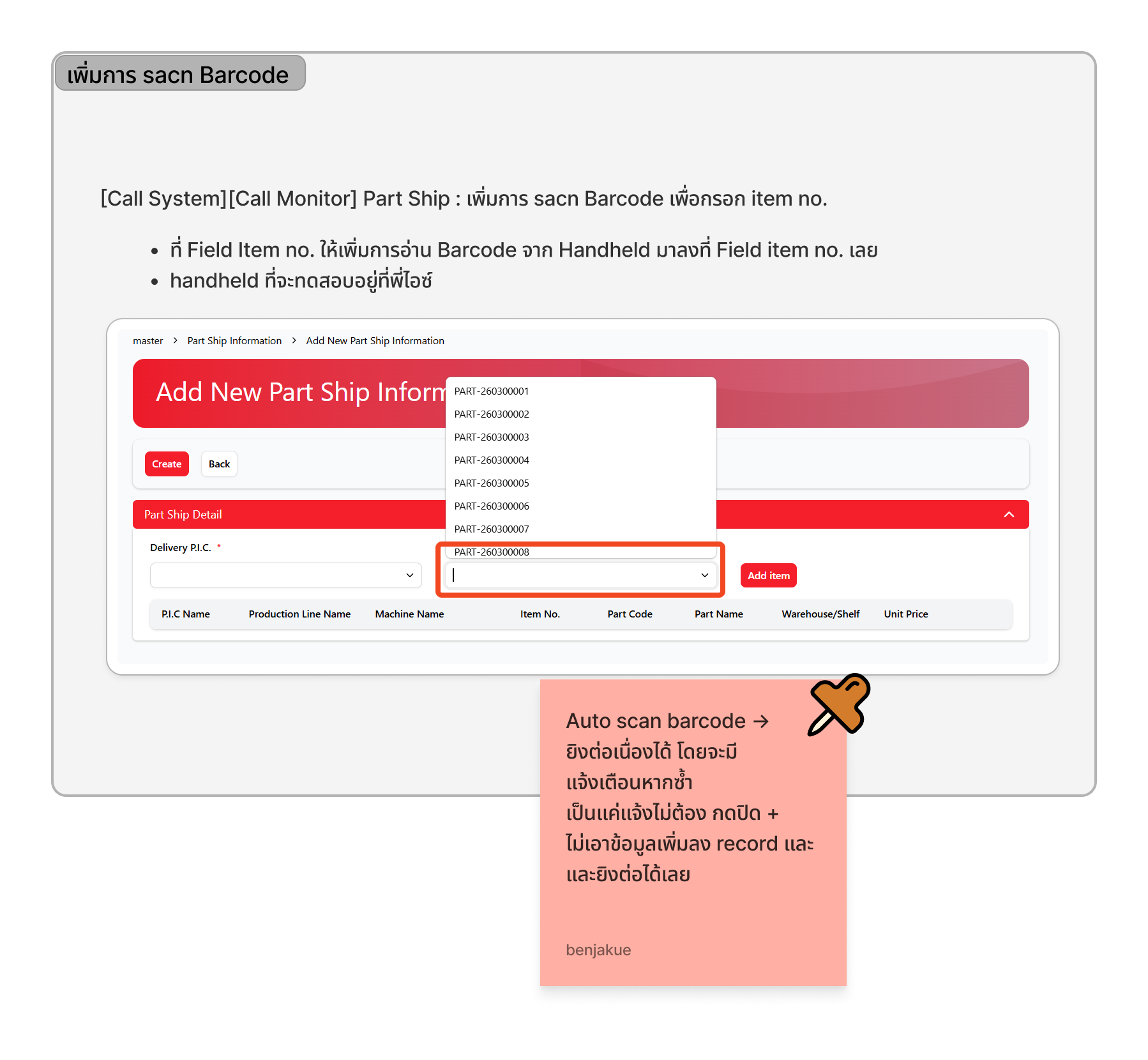 - Subject changed from [Call System][Call Monitor] Part Ship : เพิ่มการ sacn Barcode เพื่อกรอก item no. to [Call System][Call Monitor] Part Ship : เพิ่มการ scan Barcode เพื่อกรอก item no.