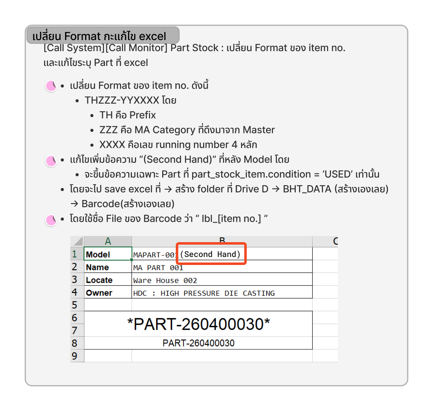 [Call System][Call Monitor] Part Stock : เปลี่ยน Format ของ item no. และแก้ไขระบุ Part ที่ excel