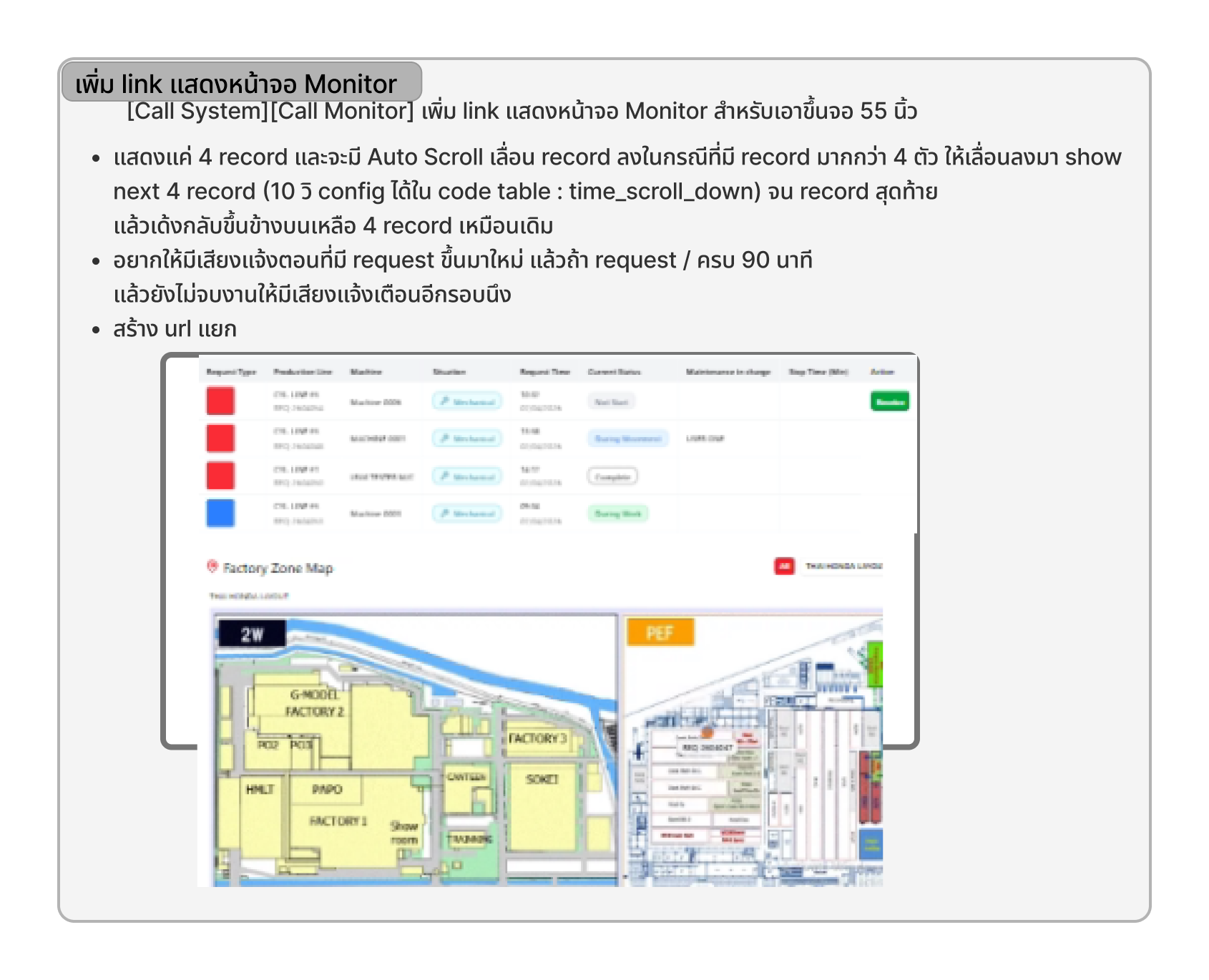 - แสดงแค่ 4 record และจะมี Auto Scroll เลื่อน record ลงในกรณีที่มี record มากกว่า 4 ตัว ให้เลื่อนลงมา show next 4 record (10 วิ config ได้ใน code table : time_scroll_down) จน record สุดท้าย แล้วเด้งกลับขึ้นข้างบนเหลือ 4 record เหมือนเดิม